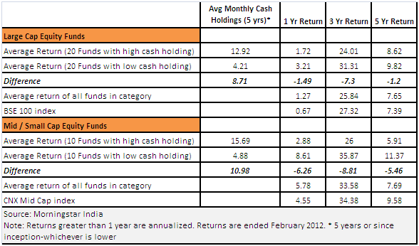 In India, fund houses like Escorts, Reliance, Sahara and Taurus are known, within the industry, to take cash calls from time to time, with cash holdings in excess of 20% on many occasions. It should be noted here that the excess cash holdings played out mostly in the period of 2008-09, when the financial crisis was underway- taking its toll on markets. Post that period, cash calls by most funds have tempered down substantially—but then again, so has the adversity in stock markets. On the other hand, fund houses like Fidelity, Franklin Templeton, HDFC and Tata have maintained lower cash holdings, ranging between 4-8% over the past five- year period, across most of their funds.